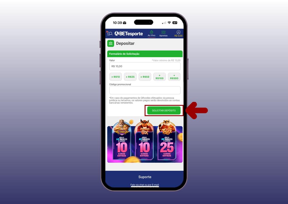 Informe o valor que deseja depositar. Se tiver algum código promocional, insira-o no campo indicado e depois clique em “Solicitar Depósito”.