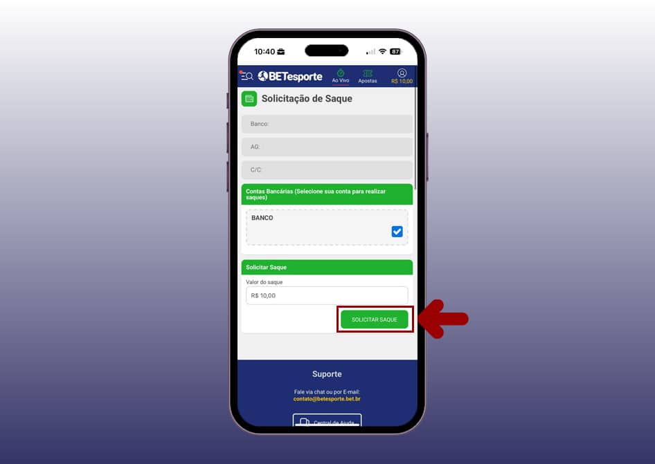 Informe o valor que deseja sacar e clique em “Solicitar Saque”. Caso a plataforma solicite mais alguns dados, preencha e finalize o processo. Em instantes, você receberá seu dinheiro na conta bancária informada.