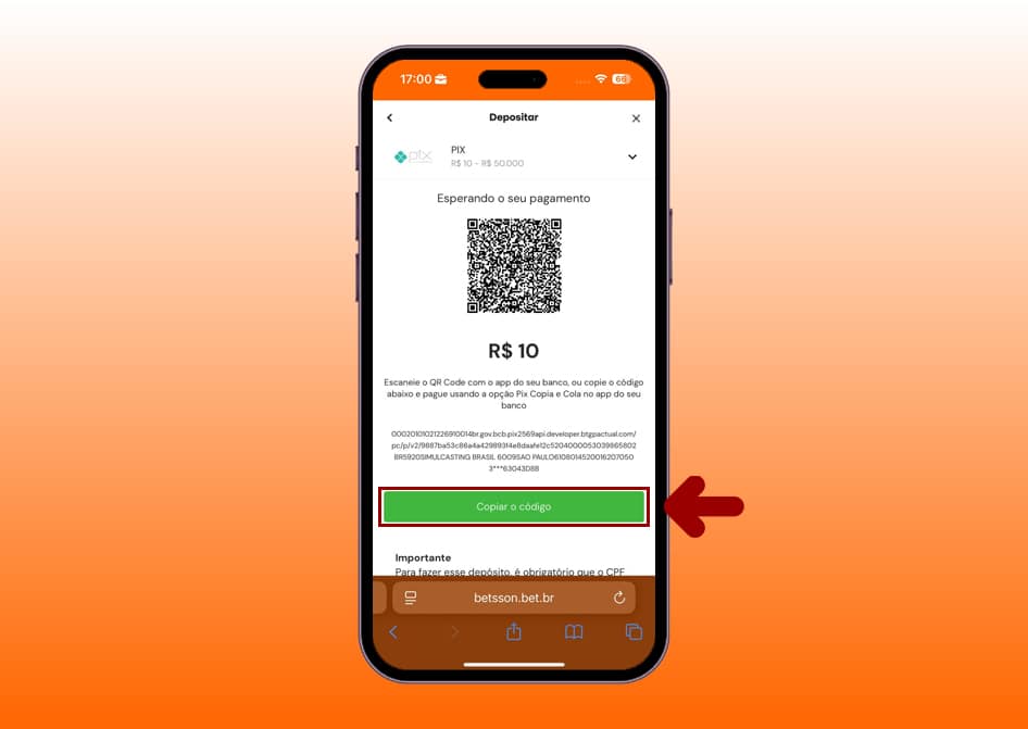 O QR Code do PIX foi gerado, clique em “Copiar o código”, vá até o aplicativo de seu banco, e pague.