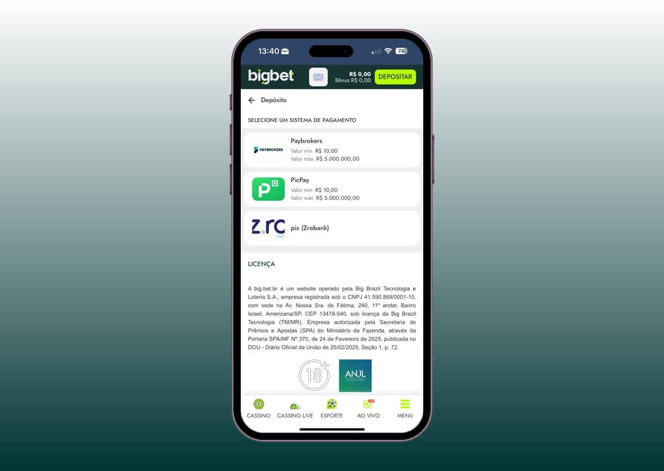 No fim das contas, é rapidez e segurança trabalhando juntas. Aqui na plataforma, o usuário ainda escolhe qual intermediadora homologada fará esse meio-campo na transação: Paybrokers, PicPay ou Zrobank. Cada uma opera de forma integrada e dentro do que a regulamentação exige, tornando as operações bem mais confiáveis para quem joga no Brasil. Limites financeiros na BigBet: