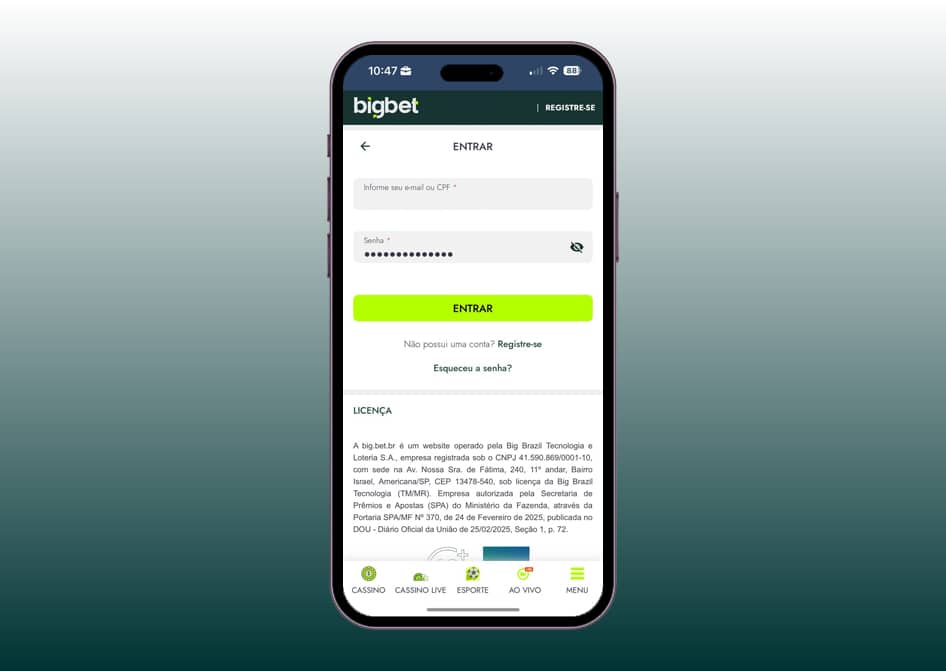 Sobre a licença, a operação no Brasil é feita pela Big Brazil Tecnologia e Loteria S.A. (CNPJ 41.590.869/0001-10), com sede em Americana/SP. A plataforma é autorizada pela Secretaria de Prêmios e Apostas (SPA) do Ministério da Fazenda, conforme a Portaria SPA/MF nº 370, publicada no Diário Oficial da União em 25/02/2025, algo que mostra alinhamento total com a regulamentação vigente destinada às apostas no país.