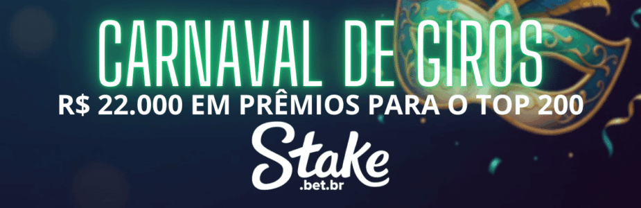 No Carnaval de Giros Stake, suas apostas nos slots elegíveis passam a contar pontos no ranking após a ativação do cupom. A promoção informa R$ 22.000 em prêmios distribuídos entre o Top 200. A seguir, veja regras, jogos participantes e principais termos.