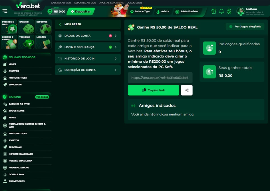 A promoção de indicação é uma das mais diretas da Vera Bet, e também uma das mais vantajosas. Cada amigo que você traz pra plataforma pode render R$ 50,00 em saldo real na sua conta. Funciona assim: o indicado precisa apostar pelo menos R$ 200,00 em jogos da PG Soft, e assim que ele cumprir essa etapa, o valor é liberado automaticamente para quem fez a indicação.