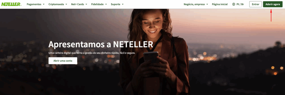 Entre no site da Neteller e clique em “Aderir agora” para iniciar o registro.